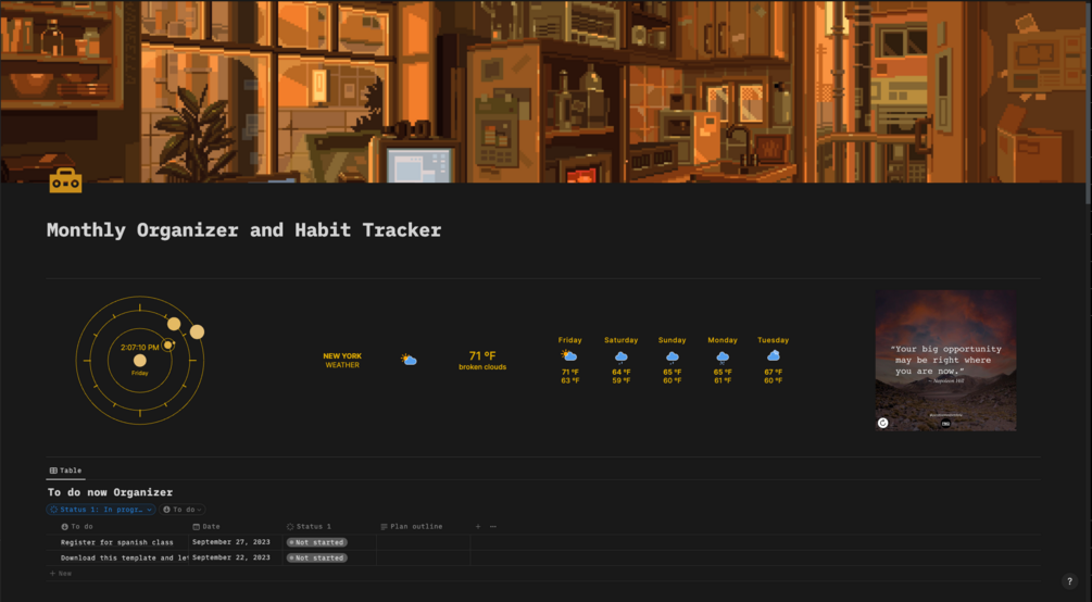 The template also features a weather forecast, a clock, and daily inspirational quotes to keep you motivated!
